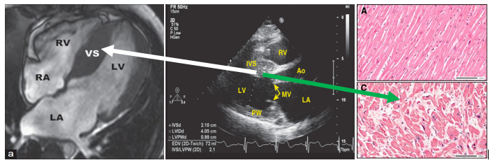 τοιχώματος της αριστερής κοιλίας, συνήθως στο μεσοκοιλιακό διάφραγμα, τουλάχιστον 15 mm. Είναι αρκετά συχνή: 1 / 400 ανθρώπους στο γενικό πληθυσμό. Οφείλεται σε γνωστή μετάλλαξη γονιδίου (στο 50 – 60%)  που δημιουργεί μείωση της λειτουργικότητας των πρωτεϊνών των μυοκυττάρων και κυρίως της μυοσίνης (60% )  ακτίνης, τροπομυοσίνης, τιτίνης, τροπονίνης