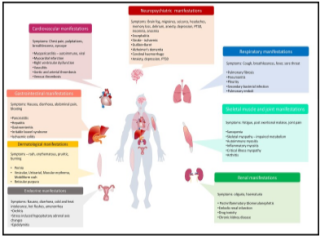 κόπωση και αυτόνομες εκδηλώσεις όπως ορθοστατική ταχυκαρδία είναι κοινά και σχετίζονται με σημαντική αναπηρία, αυξημένο άγχος και ευαισθητοποίηση του κοινού. Μια σειρά από καρδιαγγειακές ανωμαλίες (CV) έχει αναφερθεί μεταξύ των ασθενών πέρα από την οξεία φάση και περιλαμβάνουν φλεγμονή του μυοκαρδίου, έμφραγμα του μυοκαρδίου, δυσλειτουργία της δεξιάς κοιλίας και αρρυθμίες.